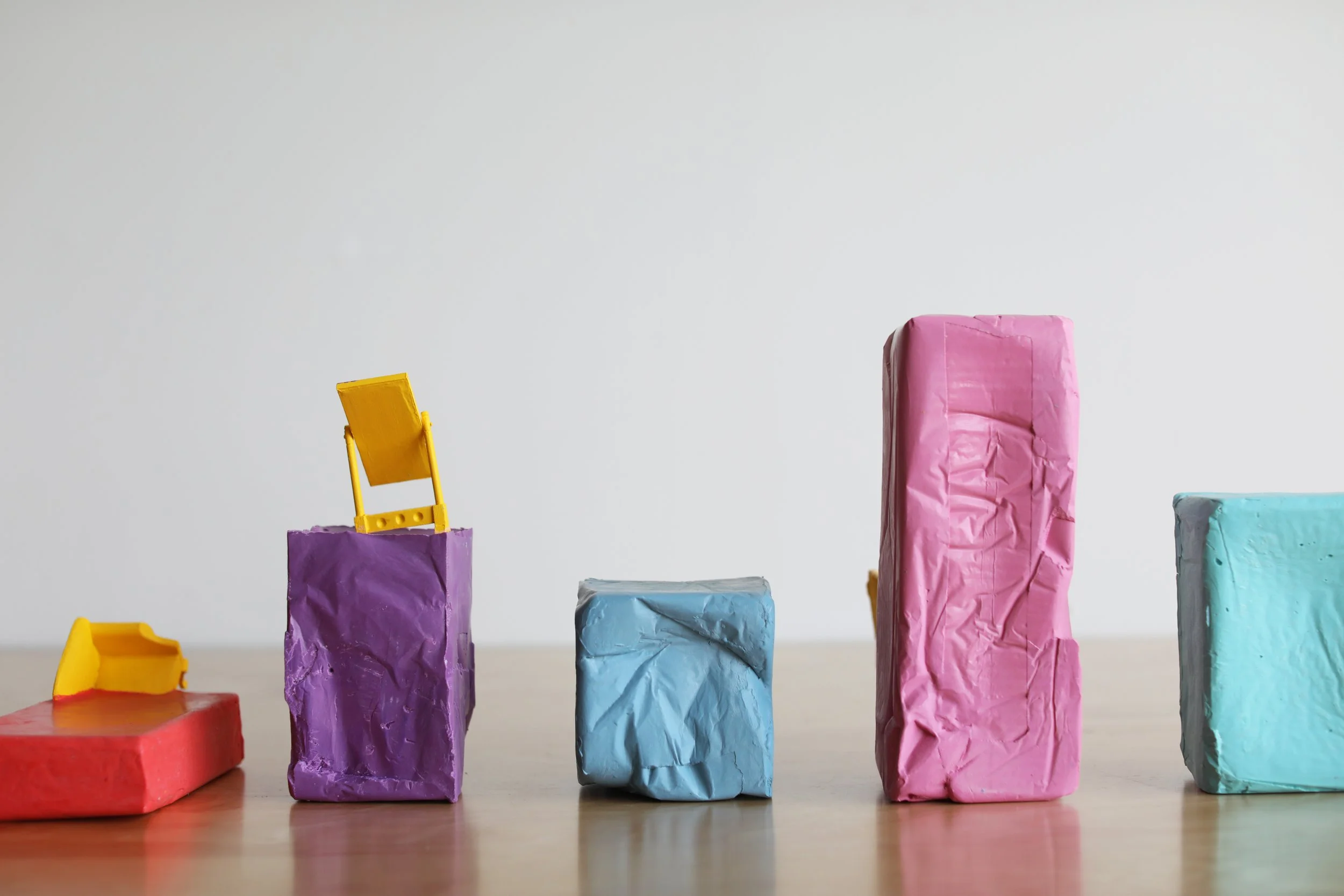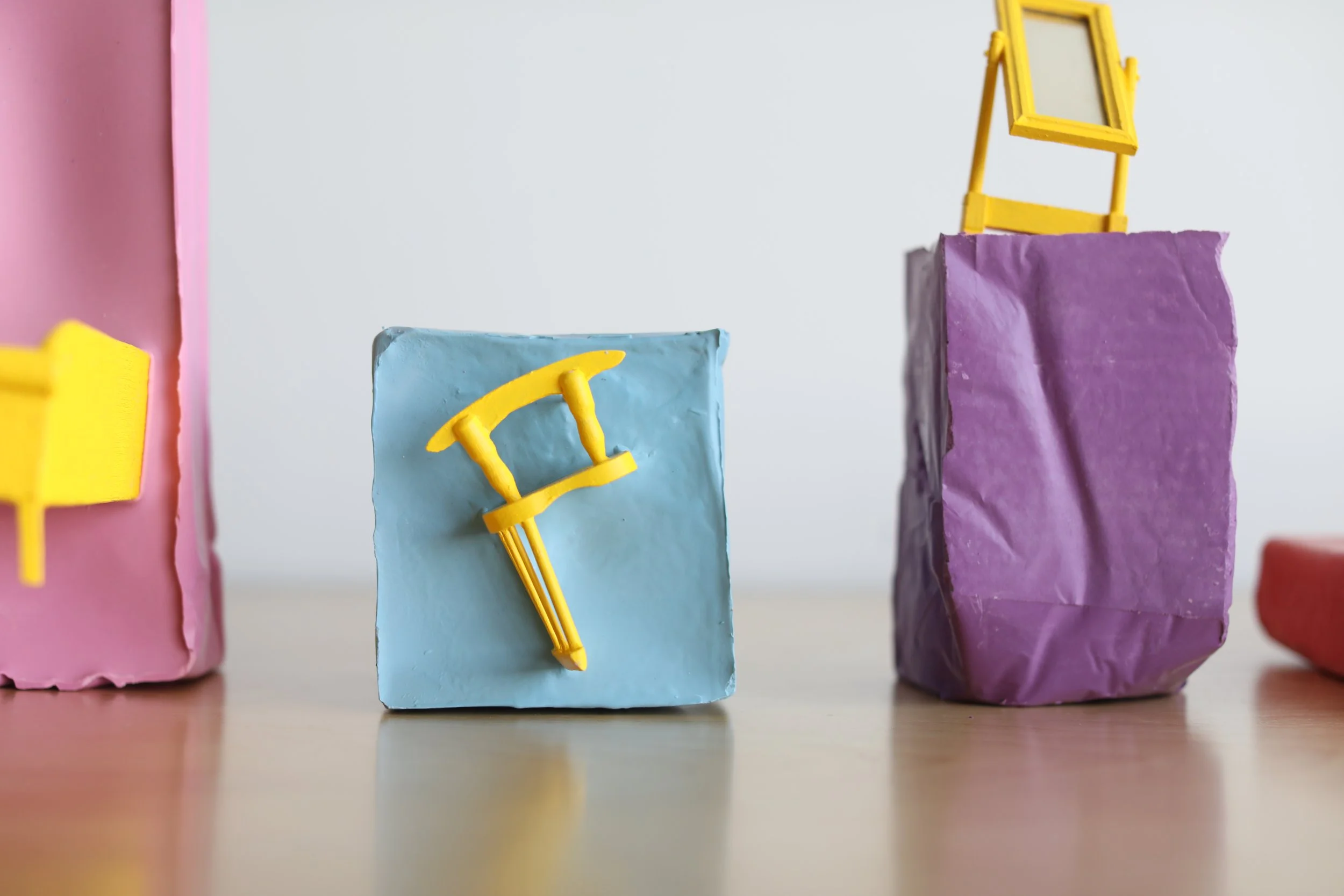 Found dollhouse furniture, yellow acrylic paint, crayon